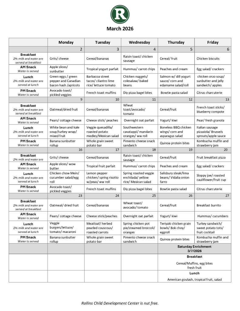 Please see our breakfast, lunch and snack menu below: